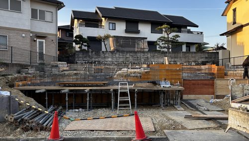 奈良の家_コートハウスの配筋検査に伺いました。道路から土地が1.5mほど高い土地のため、高基礎があったり、アプローチはスラブを跳ね出し、長めのアプローチをとった