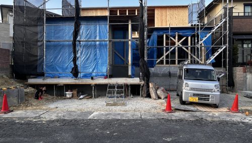 奈良の家_コートハウスは無事、上棟しまして、お施主様と一緒に確認を行いました。写真は道路側からファサードを見ます。道路から1.5mほど上がった土地になりますので