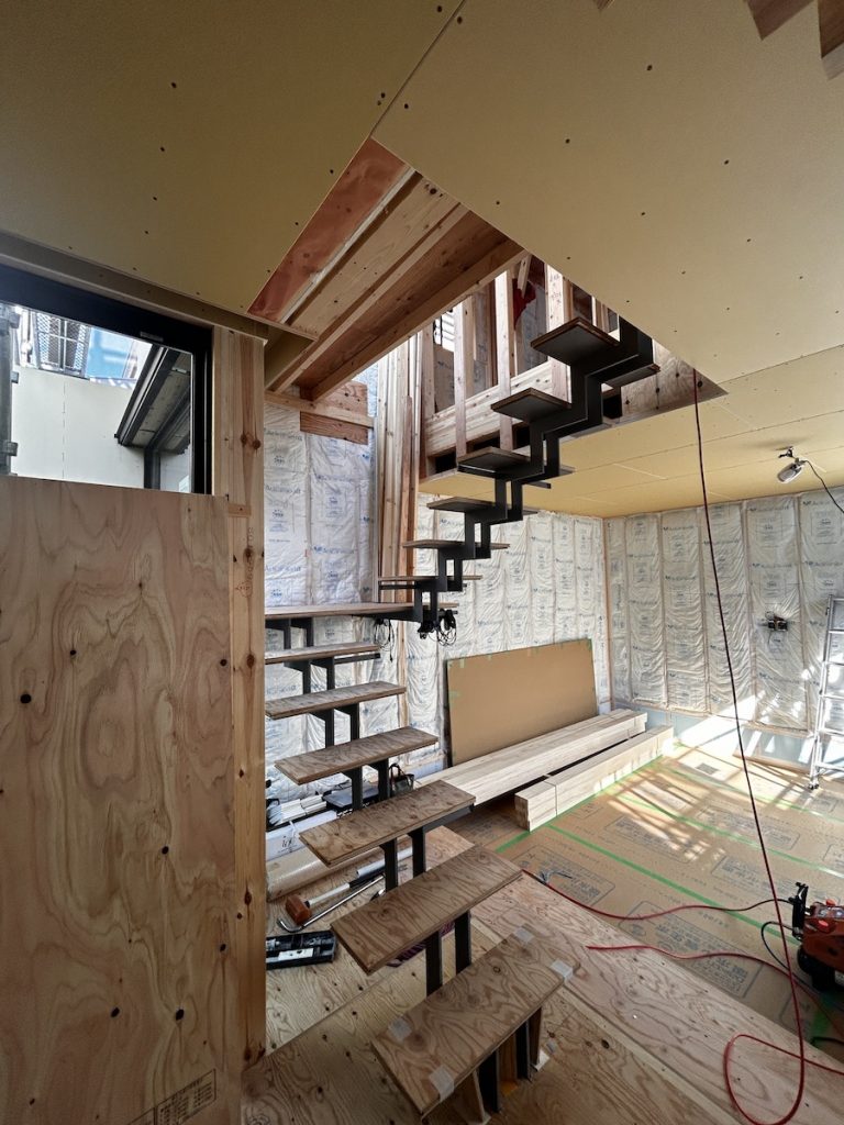 箕面の家_コートハウスはスチール階段の取付が完了しました。リビングに面した、軽快な折り返しの階段を考えていますが、インテリアとしても素敵に仕上がります。楽しみです。
