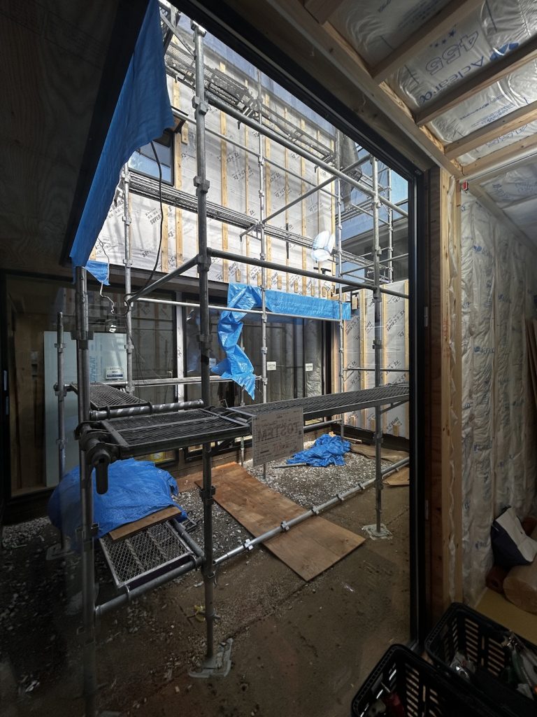 箕面の家_コートハウスは外壁下地の施工が進んでいます。中庭廻りは通気胴縁の上に、サイディングを貼り、その上からコテで塗料を塗り、仕上げていきます。